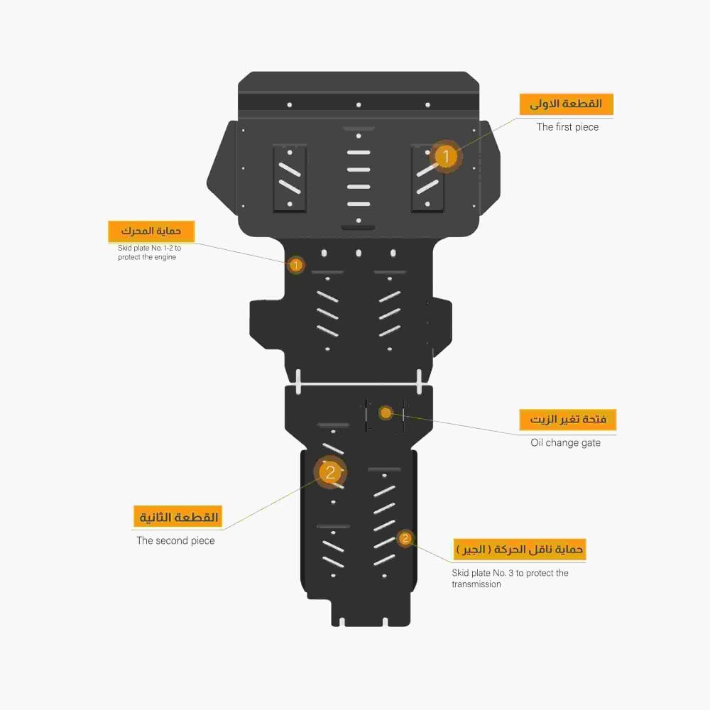 صاجة الحماية هي درع حامي و صلب لمركبتك يوفر الحماية التي تحتاجها عندما تواجه التضاريس والطرق الوعرة والصخور والحفر، مصممة بأعلى مستويات الجودة لتقديم الحماية الفائقة لأجزاء سيارتك السفلية، فهي تعمل كحاجز ضد الصدمات والصخور، بفضل تصميمها القوي والمتين، سهلة التركيب ومتوافقة مع معظم السيارات الدفع الرباعي .