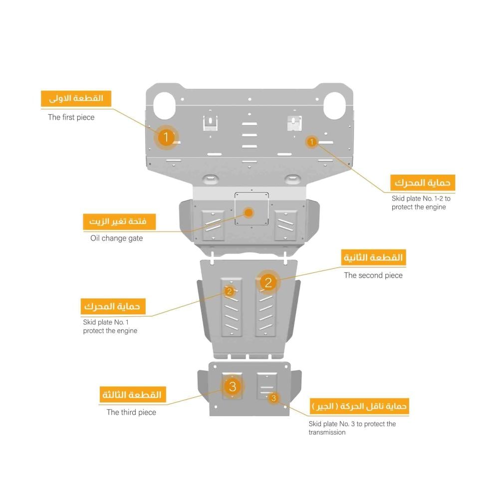 صاجة الحماية هي درع حامي و صلب لمركبتك يوفر الحماية التي تحتاجها عندما تواجه التضاريس والطرق الوعرة والصخور والحفر، مصممة بأعلى مستويات الجودة لتقديم الحماية الفائقة لأجزاء سيارتك السفلية، فهي تعمل كحاجز ضد الصدمات والصخور، بفضل تصميمها القوي والمتين، سهلة التركيب ومتوافقة مع معظم السيارات الدفع الرباعي .