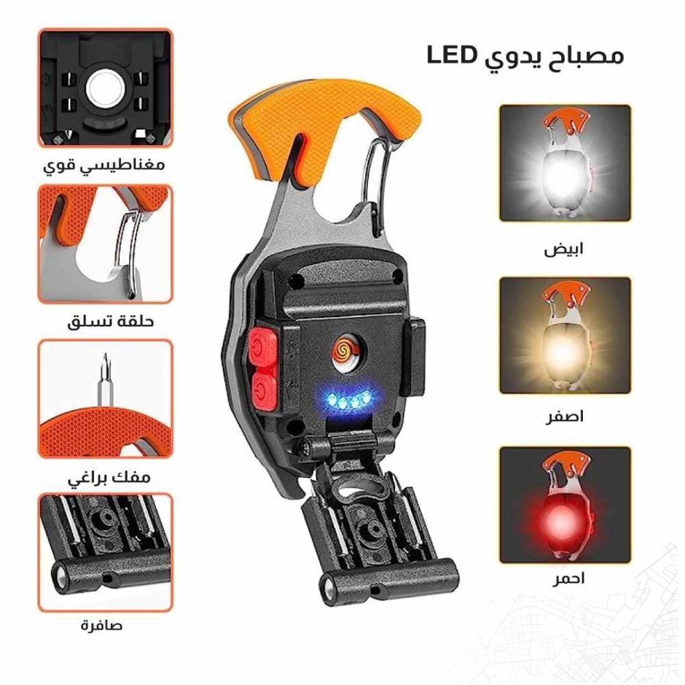- مميزات المنتج ( قاعدة لتعليق . اداة حادة للقطع . قاعدة مغناطيس 180 درجة . مؤشر للبطارية . ولاعة . مفك براغي . صافرة انذار .