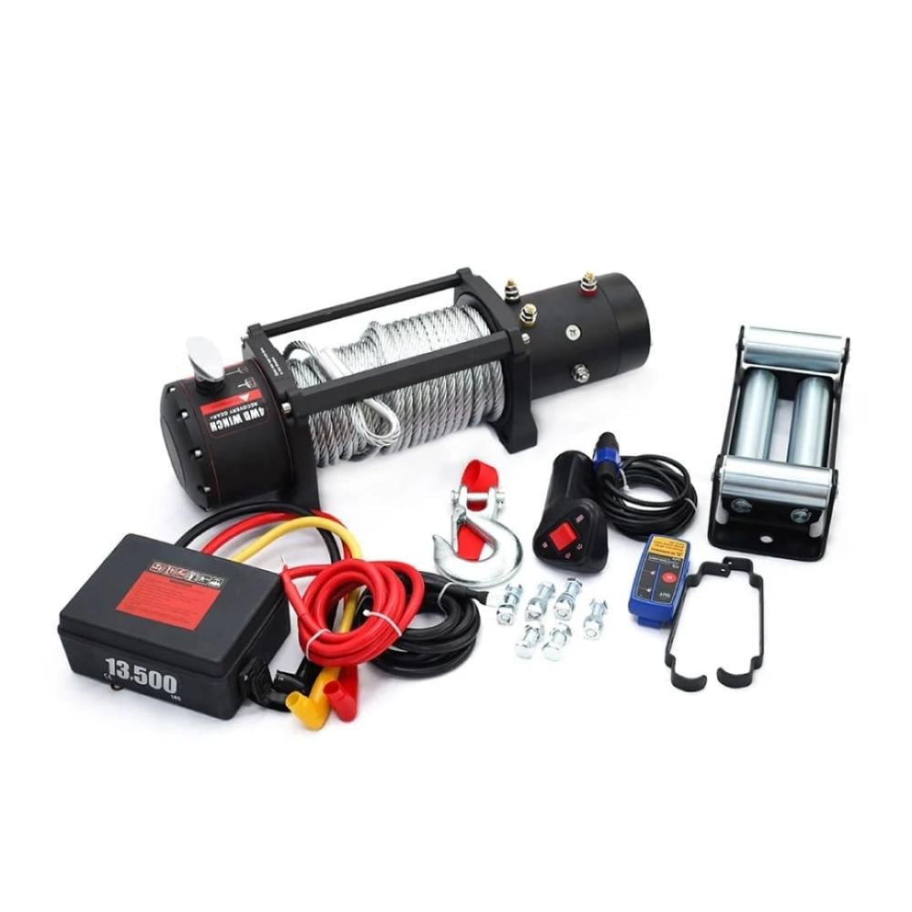 يأتي مع الونش ريموت سلكي ولا سلكي للتحكم فيه مع خطافات السحب والإكسسوارات الخاصة